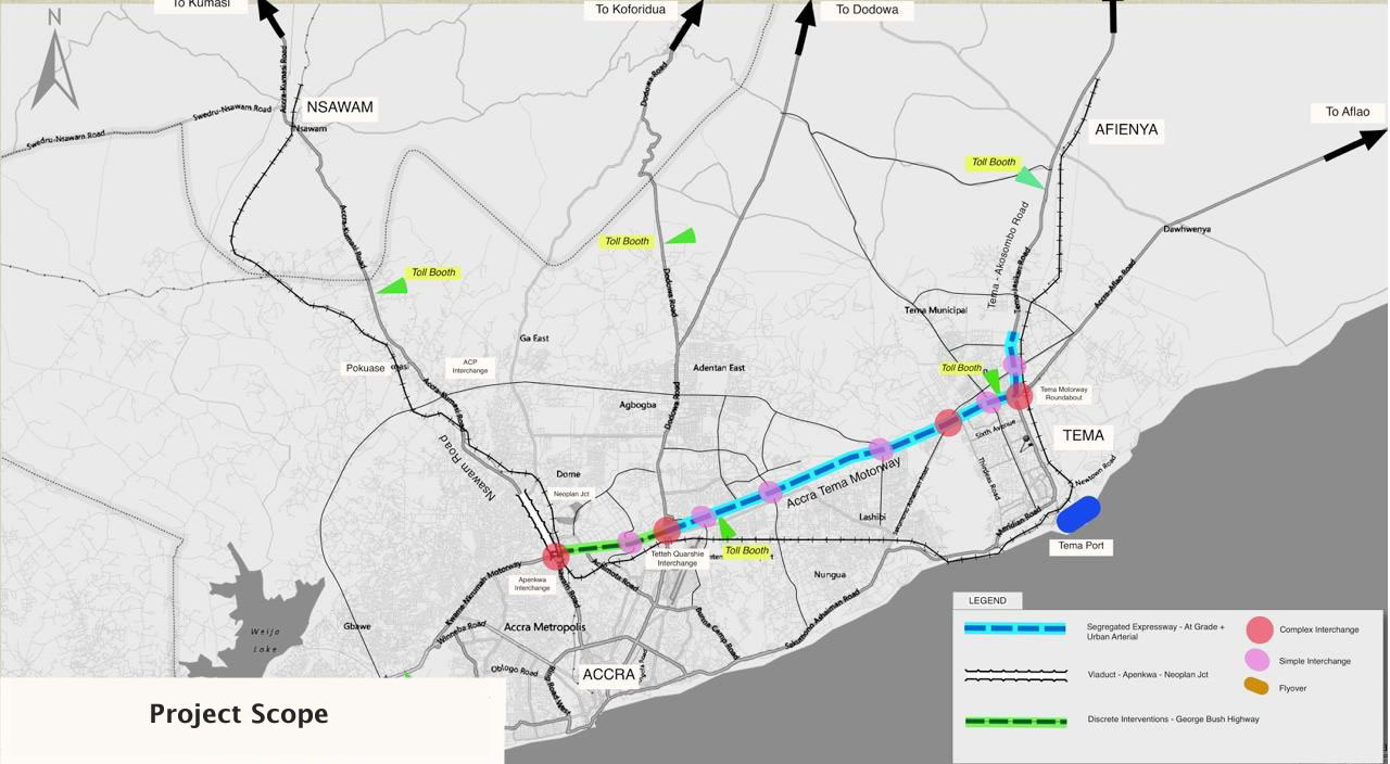 The performance of the Accra-Tema Motorway is influenced by the efficiency of the junctions and road sections that lead up to it in both directions. This includes Neoplan junction on the N6 leading into Apenkwa Intersection and the George W. Bush Highway that forms part of the N1 between Apenkwa and Tetteh Quarshie. On the Tema end of the Motorway, Ashaiman junction (N2) leading to the Tema Roundabout is another area of influence for the Motorway. There are traffic bottlenecks, which carry valuable goods to and from major cities like Kumasi and Tamale, impede the movement of vehicles causing delays. The Government of Ghana (GoG) has therefore expanded to scope of the Project to include these additional sections.