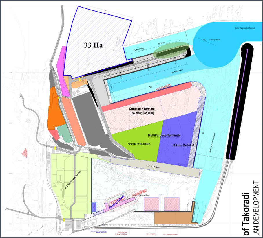The Updated Final Master Plan (dd 21/09/2015) has been established taking into account the physical conditions at the port, initial traffic projections and technical parameters. The master plan provides a phased development of the port to cater for the projected traffic up to the forecast horizon in 2035. In addition, in June 2016, a revised layout has been presented. Figure 3-1 shows this revised layout. The primary components of the master plan include: